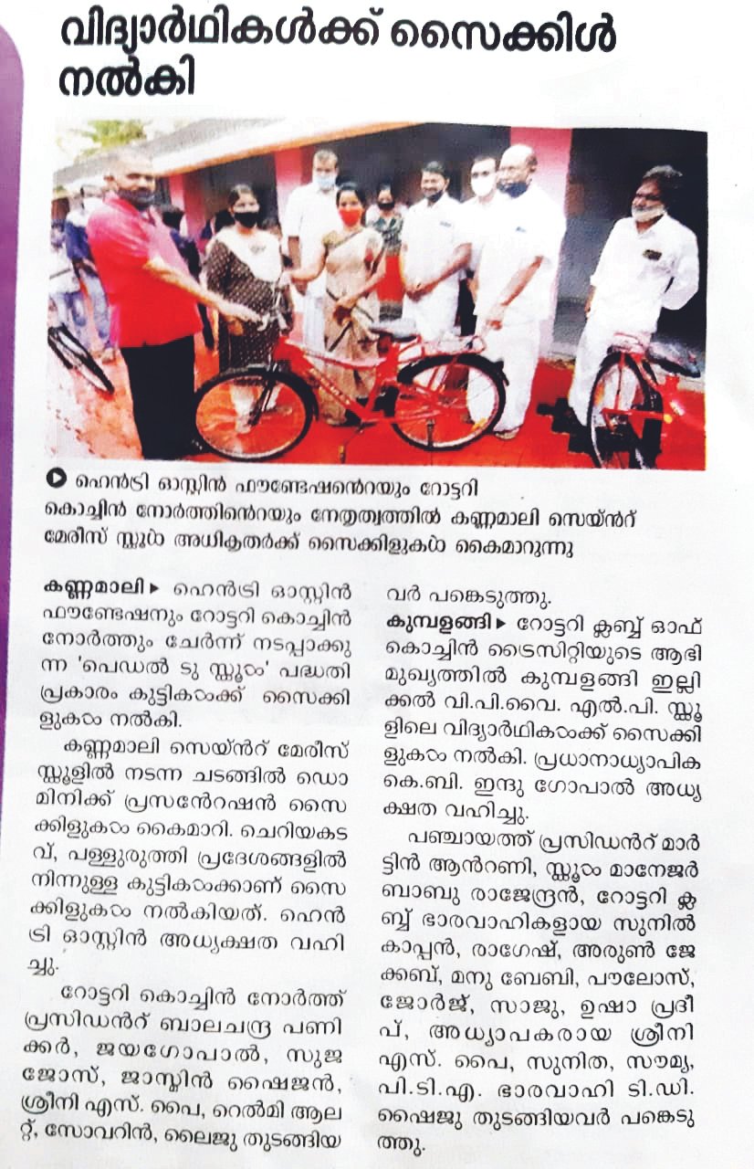 സ്കൂൾ കുട്ടികൾക്ക് പൊതു ഇടങ്ങളിൽ യാത്ര സുരക്ഷിതമാക്കാൻ സുമനസ്സുകളുടെ സഹായത്തോടെ ഹെൻറി ഓസ്റ്റിൻ ഫൗണ്ടേഷൻ ‘പെടൽ ടു സ്ക്കൂൾ’ പദ്ധതി വഴി 10 വിദ്യാർത്ഥികൾക്ക് സൈക്കിളുകൾ നൽകി.