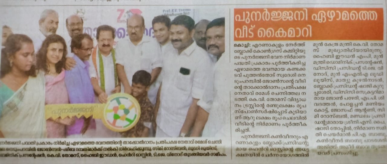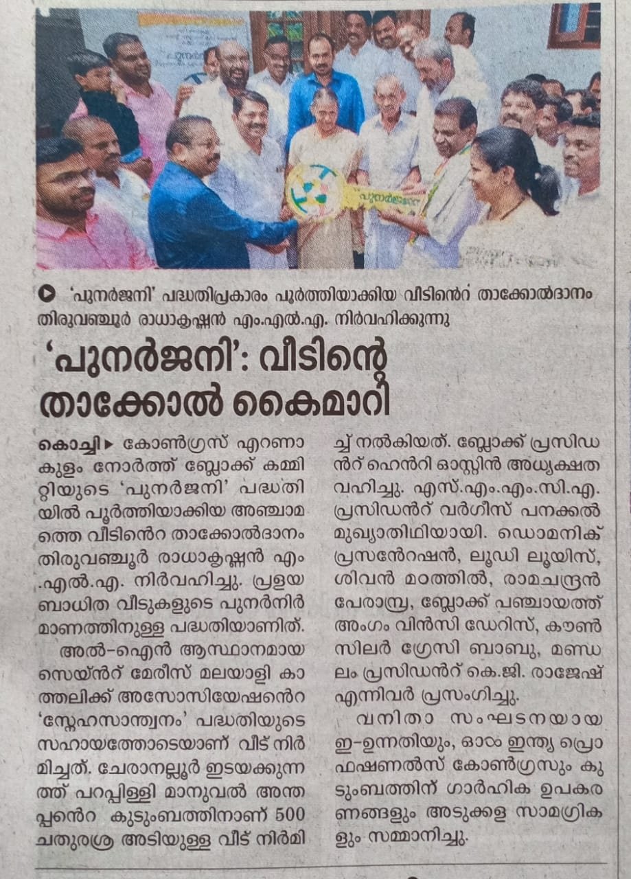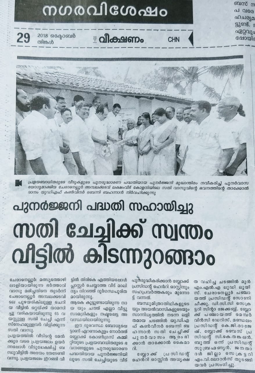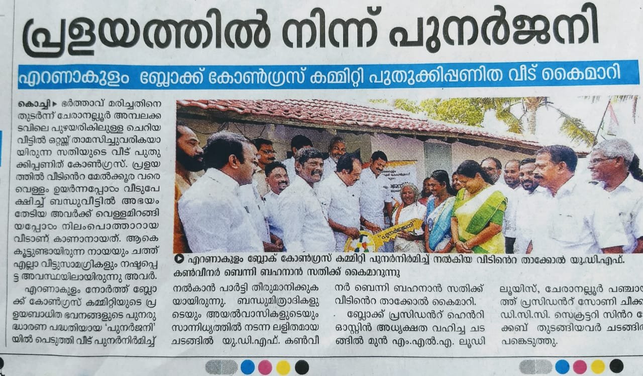 പ്രളയാനന്തരം സാരമായ കേടുപാട് പറ്റിയതും പൂർണ്ണമായും തകർന്ന് പോയതുമായ വീടുകളുടെ പുനർനിർമ്മിതിക്കായി ഹെൻറി ഓസ്റ്റിൻ വിഭാവനം ചെയ്തു നേതൃത്വം നൽകിയ കോൺഗ്രസ്സ് എറണാകുളം നോർത്ത് ബ്ലോക്ക് കമ്മിറ്റിയുടെ 'പുനർജ്ജനി' പദ്ധതിയിലൂടെ 7 വീടുകൾ പൂർത്തികരിച്ച് താക്കോൽദാനം നടത്തി. ചേരാനല്ലൂർ പഞ്ചായത്തിൽ 6 വീടുകളും പുത്തൻതോട്ടിലെ ഒരു വീടുമാണ് പദ്ധതിയിലൂടെ നിർമ്മിച്ച് നൽകിയിട്ടുള്ളത്.