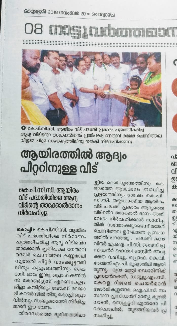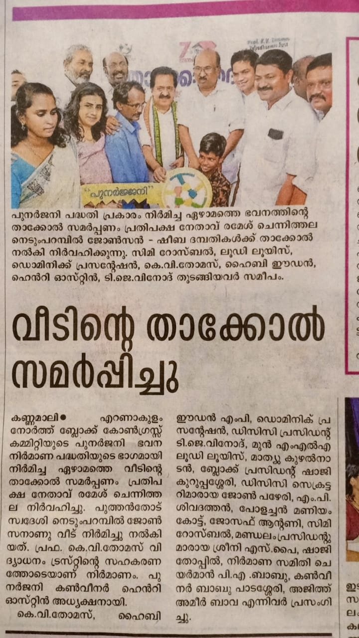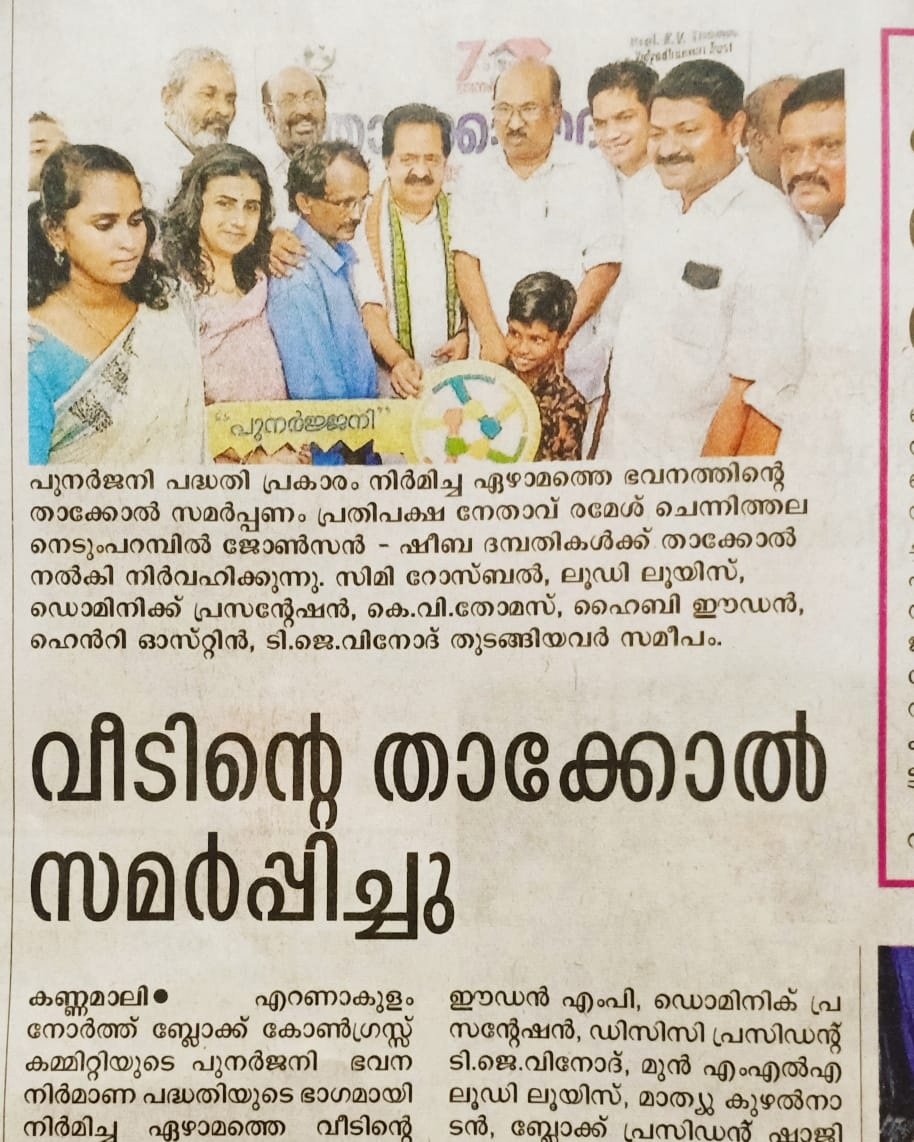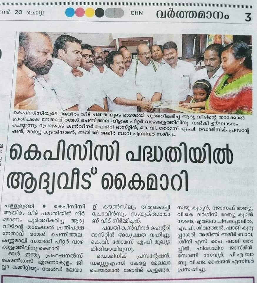പ്രളയാനന്തരം സാരമായ കേടുപാട് പറ്റിയതും പൂർണ്ണമായും തകർന്ന് പോയതുമായ വീടുകളുടെ പുനർനിർമ്മിതിക്കായി ഹെൻറി ഓസ്റ്റിൻ വിഭാവനം ചെയ്തു നേതൃത്വം നൽകിയ കോൺഗ്രസ്സ് എറണാകുളം നോർത്ത് ബ്ലോക്ക് കമ്മിറ്റിയുടെ 'പുനർജ്ജനി' പദ്ധതിയിലൂടെ 7 വീടുകൾ പൂർത്തികരിച്ച് താക്കോൽദാനം നടത്തി. ചേരാനല്ലൂർ പഞ്ചായത്തിൽ 6 വീടുകളും പുത്തൻതോട്ടിലെ ഒരു വീടുമാണ് പദ്ധതിയിലൂടെ നിർമ്മിച്ച് നൽകിയിട്ടുള്ളത്.